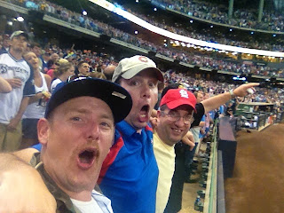 Let me let you in on an age old ballpark secret. If you know people, such as these 3 gentlemen pictured above and below, who have box seats, all you have to do is buy a scalped 10$ ticket in the parking lot, and have one of the guys meet you on the concourse with 2 of the box seats tickets after the other guys are seated down front. You then just show the box seat ticket to the usher, and you're in 100 level. Easy peasy! This only works if it isn't packed. And as most battles for the basement, it wasn't.